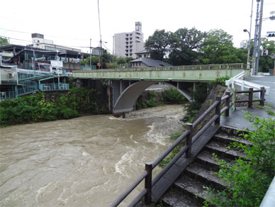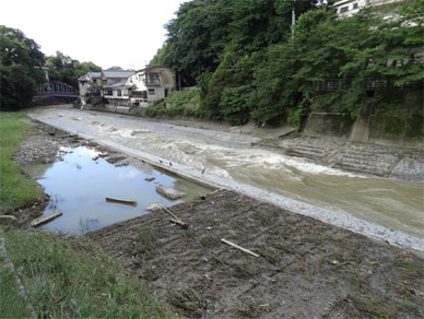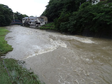 局所的短時間豪雨が行きすぎた後の川の様子を見て