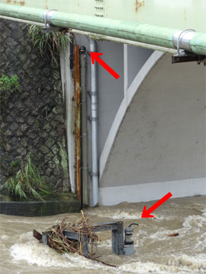水位観測機器を探すと橋の袂と川の中に何やら怪しいものが。