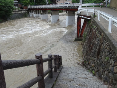 親水護岸が全く見えない増水っぷり。