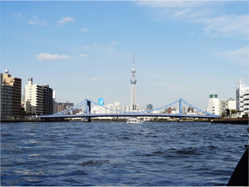 清洲橋とスカイツリーを一緒に見られるように川の中央まで来て向きを変えてくださったのです。