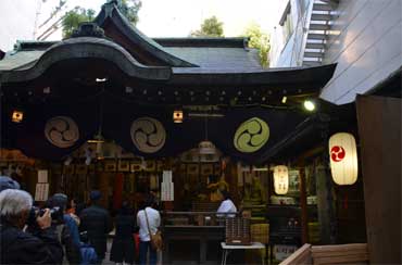 ビルの谷間の神社には参拝者の長蛇の列。