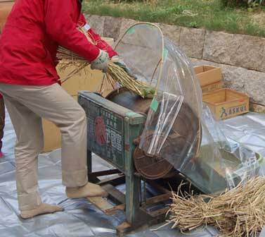 足踏式脱穀機の使い方。