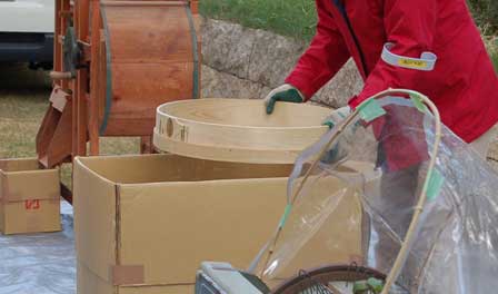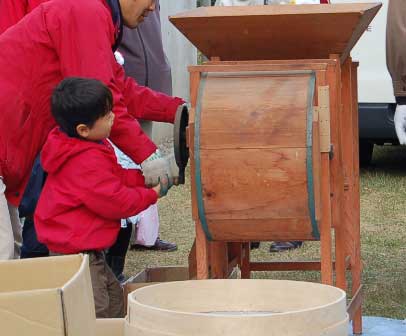 同時にハンドルを回して風を送り、軽い葉っぱの切れ端や空の籾を吹き飛ばし