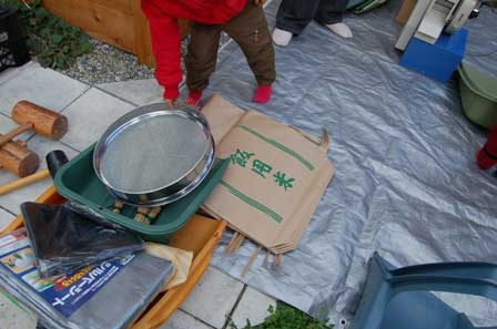 脱穀した籾には稲の葉っぱや茎などたくさんいらない部分が混じっています。