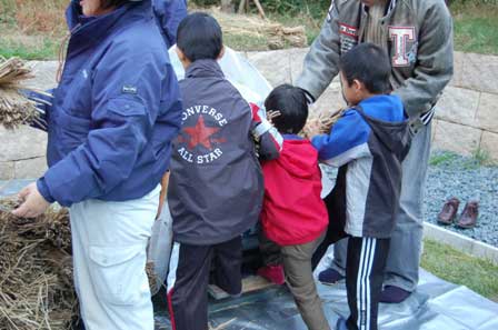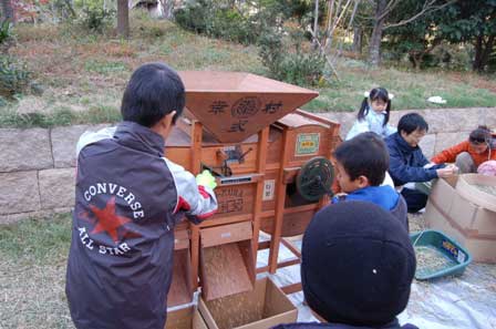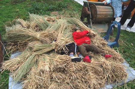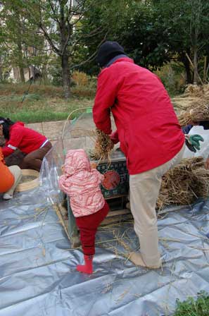 さぁ、大人も子供もみんなで脱穀。