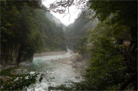 雨と霧の中、猿飛峡というところまで歩くことになりました。