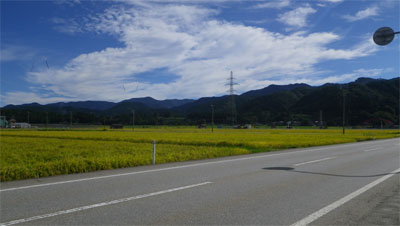 愛本堰堤のすぐ下流にはひろいひろい美しい扇状地の田園風景が広がっています。