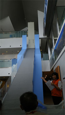 という事でエントランスに設けられたこの雪崩専用滑り台の下にカメラを持ってわくわく参加。