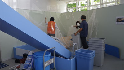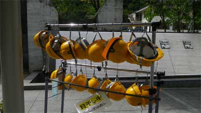 博物館入口には見学会で使用するヘルメットが天日干し中でした。