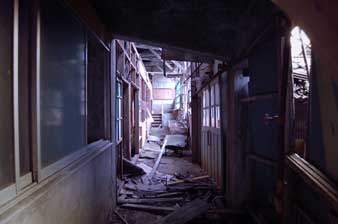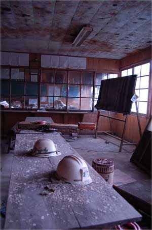 荒れ果ててしまった事務室に残るヘルメットは閉山の時には
