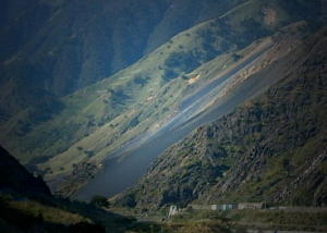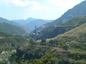 銅親水公園。道路からあまりにも巨大な砂防ダムの提体が見えています。