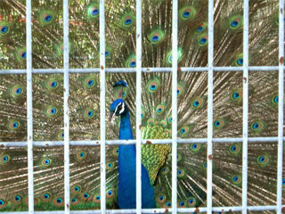 訓練されているかのように広げたままうろつく孔雀。