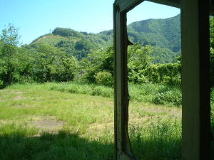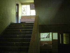 廊下も短く、校庭に面した窓のガラスは破られていました。