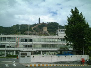 大雄院精錬所の遺構の上にそびえる大煙突。