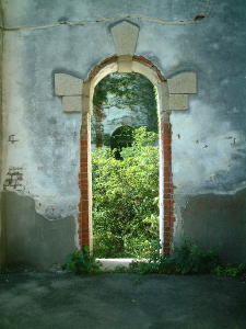 漆喰がはがれはじめて覗く煉瓦と緑の蔦。