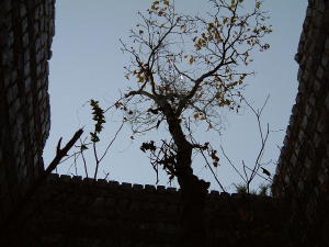 倉庫の部屋を巡ります。 朝の月を梢に飾りながら部屋の中一杯に広がろうとする木です。