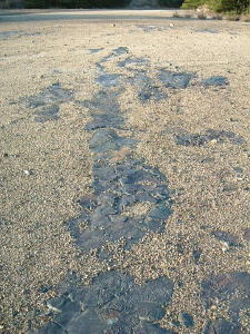砂地の下に顔を出している硬い物は岩ではなくカラミです。