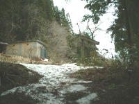 上がってくる坂道の上に石垣と階段が雪になぎ倒されて草に埋もれるように