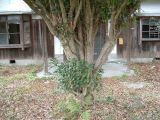 鉱山長邸の玄関を隠すように大きく育った金木犀は