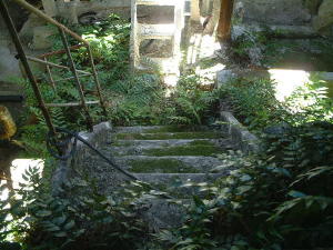 この建物は水と白いコンクリートと建材、進出してきた羊歯植物で
