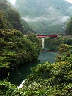 帰り道、ダム湖の緑を見ながら産業遺構について