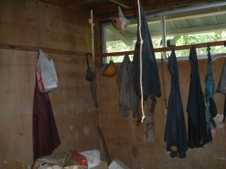 休憩室の壁に作業服が幾つも並んでいます。
