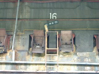 トラックの流れの合間を縫って鉱石搬出口の下にやってきました。