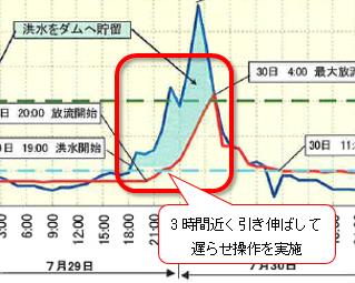 通常1時間のところを3時間も遅らせ、更に放流量の増え方もゆっくりにしているのです。