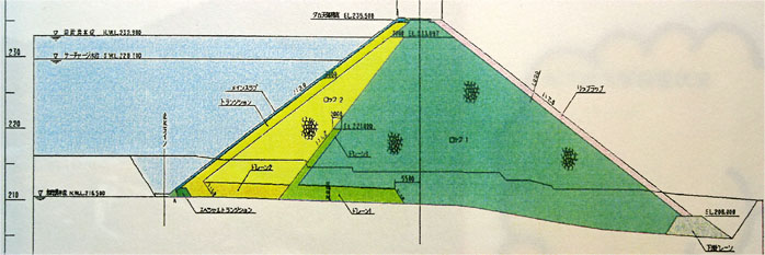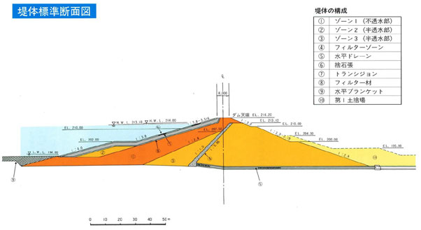 国内最大級のゾーン型アースダムである水資源機構の中里ダムの断面図です。